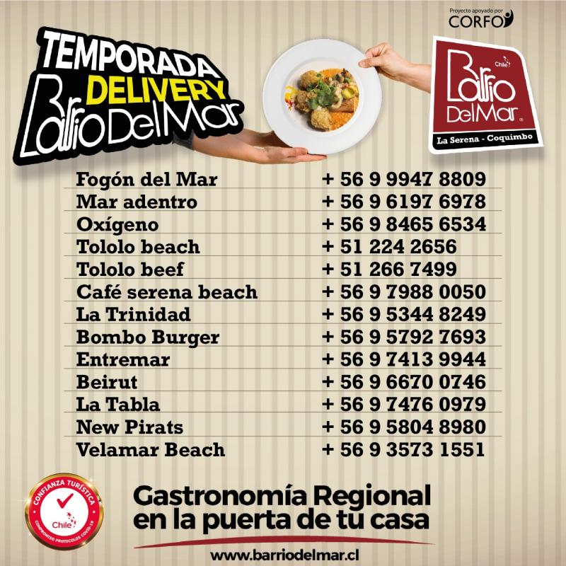 Cabe destacar que Barrio del Mar es un proyecto apoyado por Corfo, que desde sus inicios hace 3 años, ha fomentado la asociatividad y el trabajo conjunto de las empresas turísticas y gastronómicas del borde costero de La Serena y Coquimbo. Hoy está formado por 18 empresas en total, las que en forma paulatina se van a ir sumando al formato delivery.