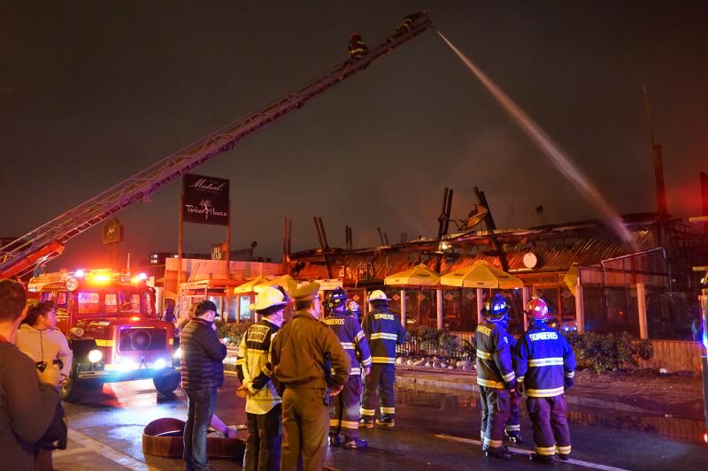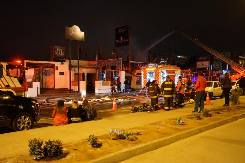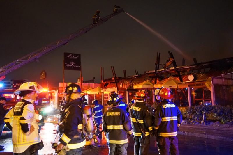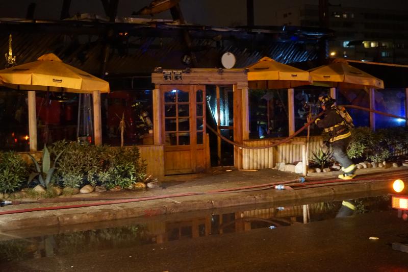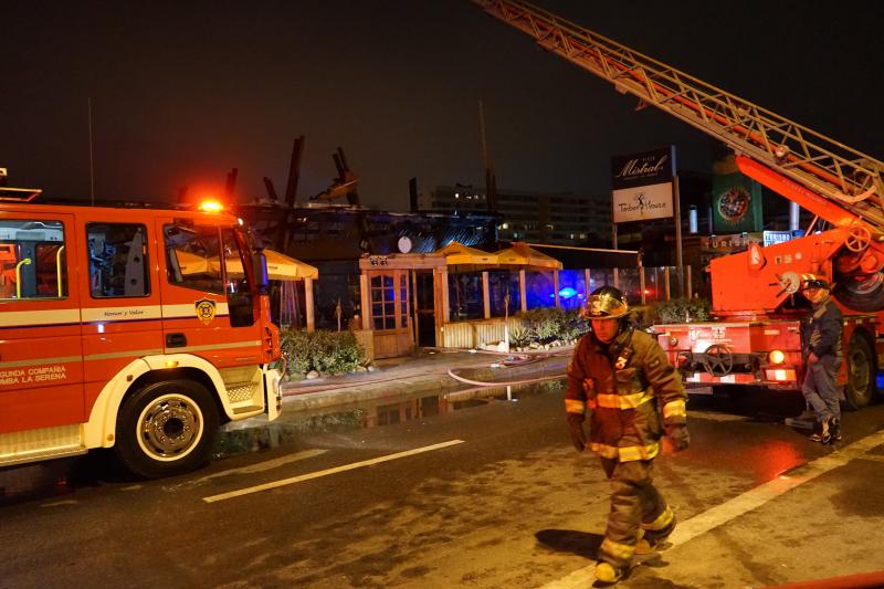 Siete compañías del Cuerpo de Bomberos de La Serena, con el apoyo de tres compañías del Cuerpo de Bomberos de Coquimbo, trabajaron esta noche en el combate de un siniestro que consumió por completo el restaurante “TimberHouse“, ubicado en la Avenida del Mar de La Serena.