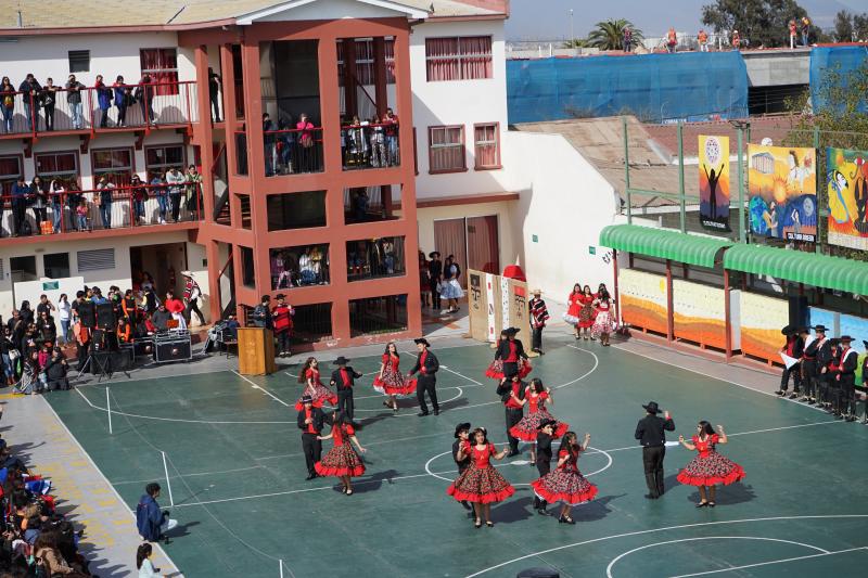 La gala comenzó con la interpretación del Himno Nacional e izamiento de nuestra Bandera. Más tarde fue el turno de los profesores y administrativos del establecimiento quienes dieron la bienvenida interpretando nuestro baile nacional. Luego, uno a uno los cursos fueron presentando sus bailes.
