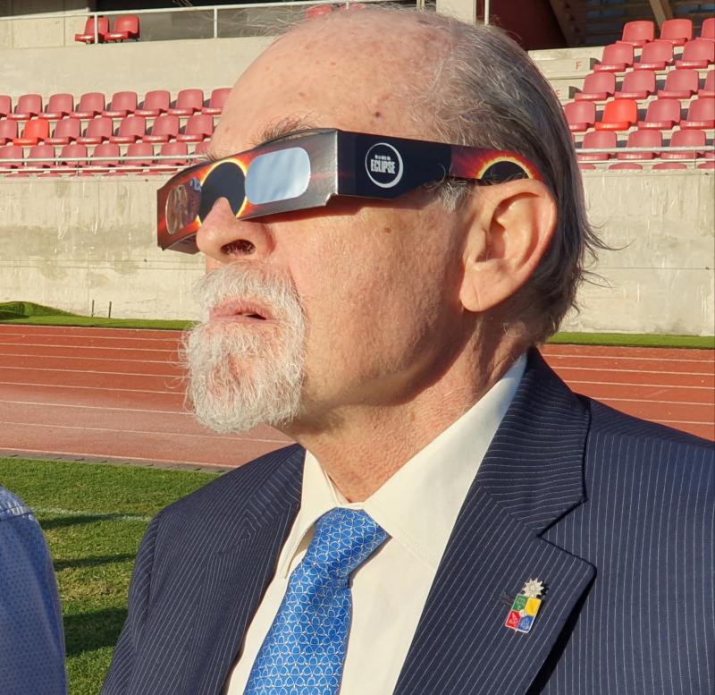 El astrónomo José Maza luce uno de los lentes del programa radial “En la Ruta del Eclipse”