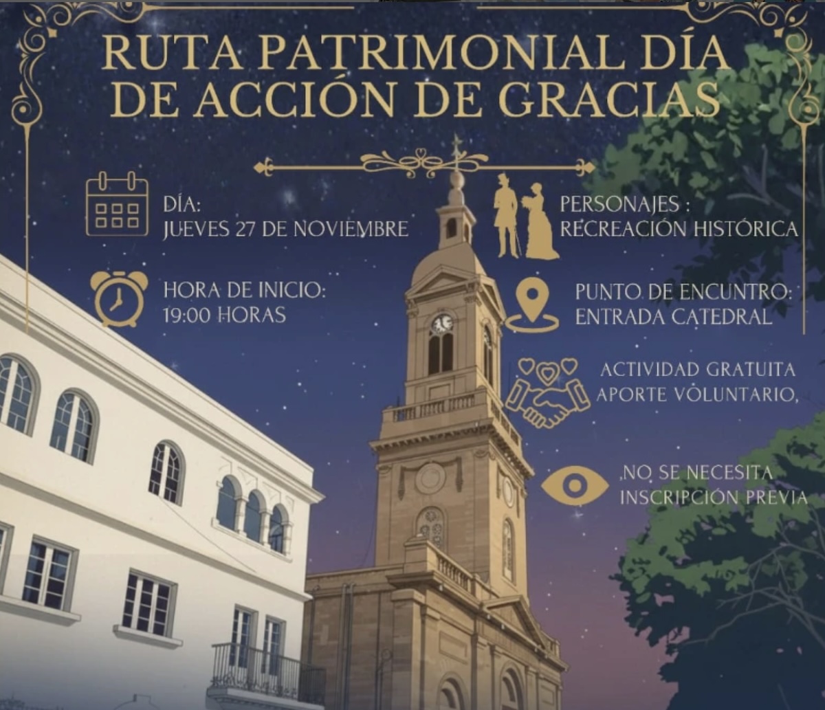Hoy jueves 27 de noviembre, a las 19:00 horas, se realizará una nueva edición de la Ruta Patrimonial – Día de Acción de Gracias, actividad gratuita que invita a la comunidad a recorrer el centro histórico de La Serena a través de relatos, recreaciones y escenas que evocan distintos momentos de la antigua Provincia de Coquimbo.